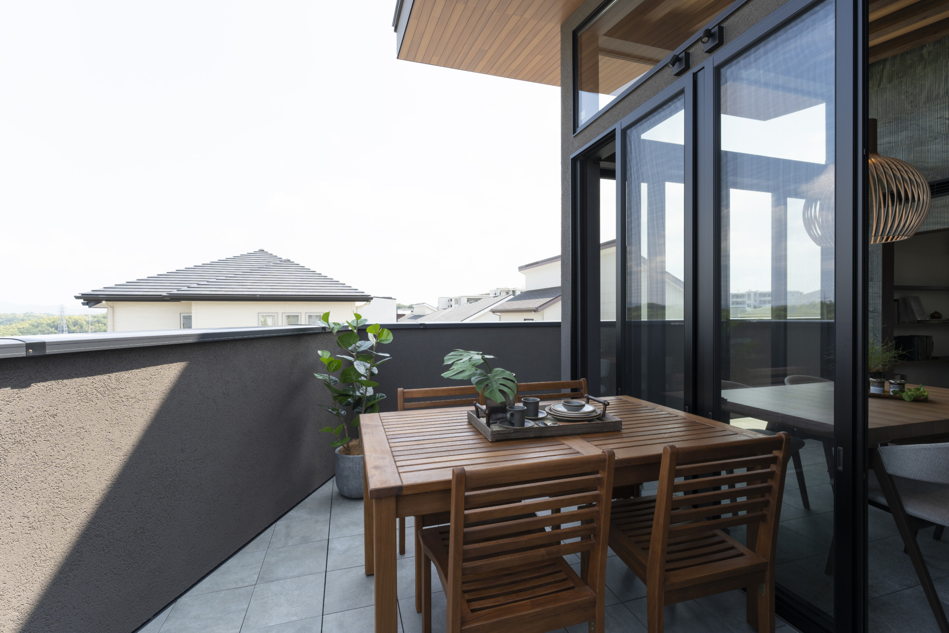 朝日を浴びながら家族で朝食をとったり、休日には友人を招いてティーパーティーをしたりと、日々の暮らしに非日常のエッセンスを加えてくれるスペースです。