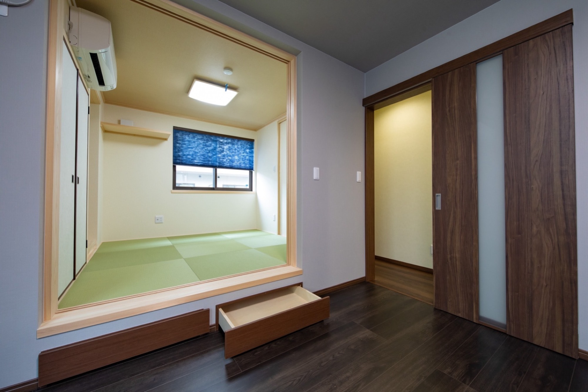 リビングの一角に、引き出し式の収納を備えた小上がりの和の空間を設けました。
