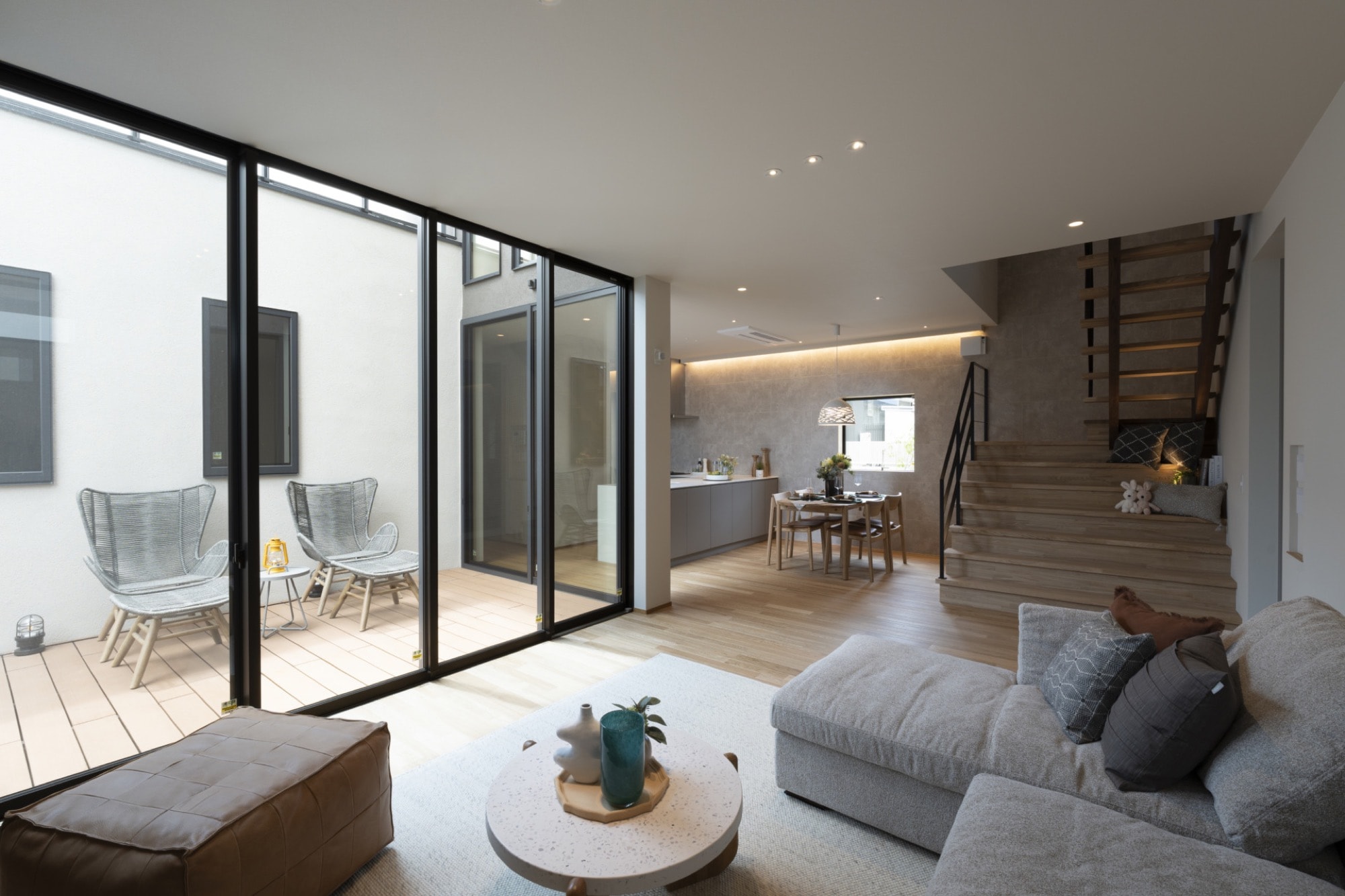 LDKと中庭の間に段差のないウッドデッキを設置、面するテラス窓を天井高とし、屋内外の境界を感じさせないシームレスな繋がりを実現しました。