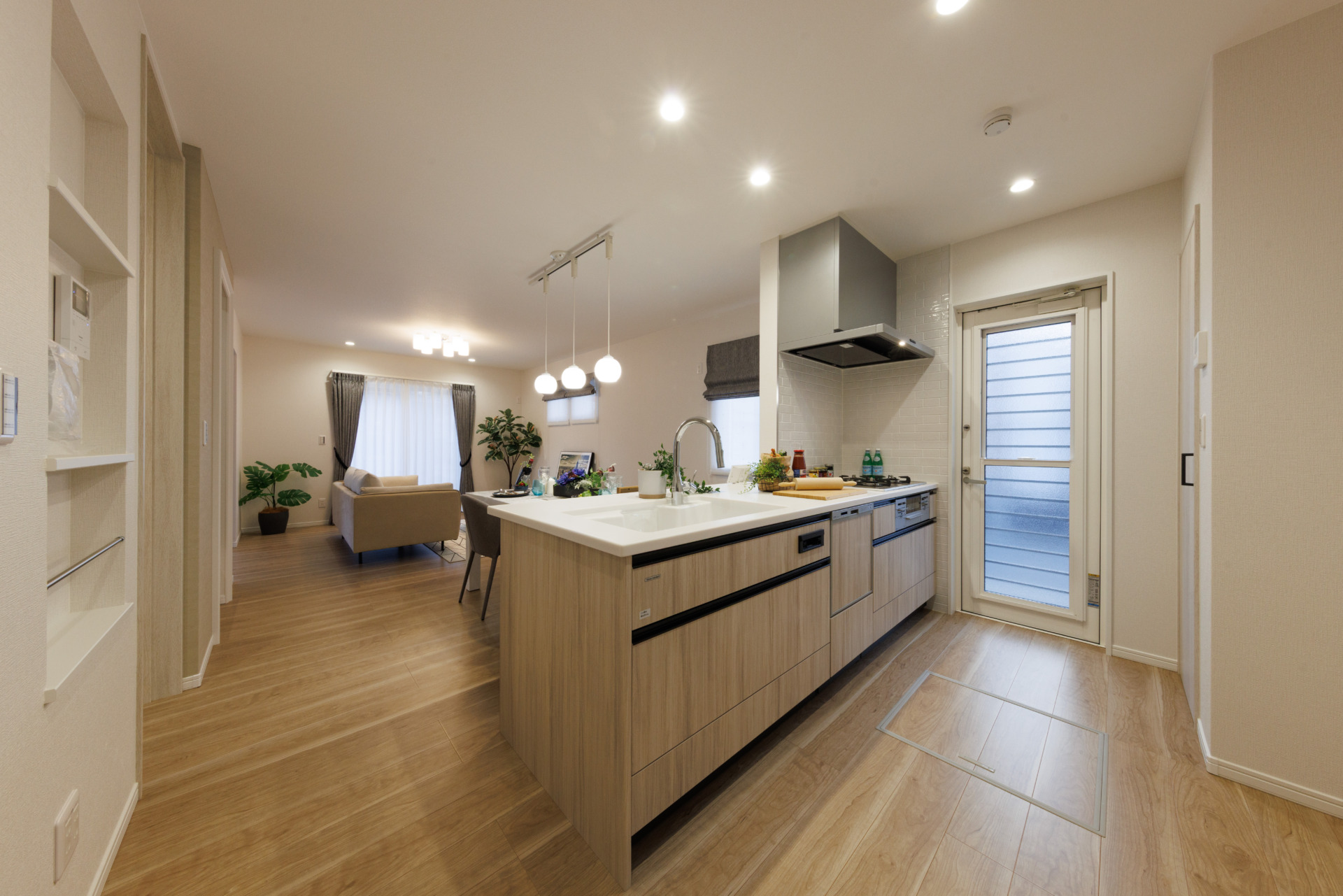 対面式キッチンには保存食品に便利な床下収納を備え、脱衣室は着替えにゆとりのある広さを確保。和の落ち着きと暮らしやすさを両立した住まいです。