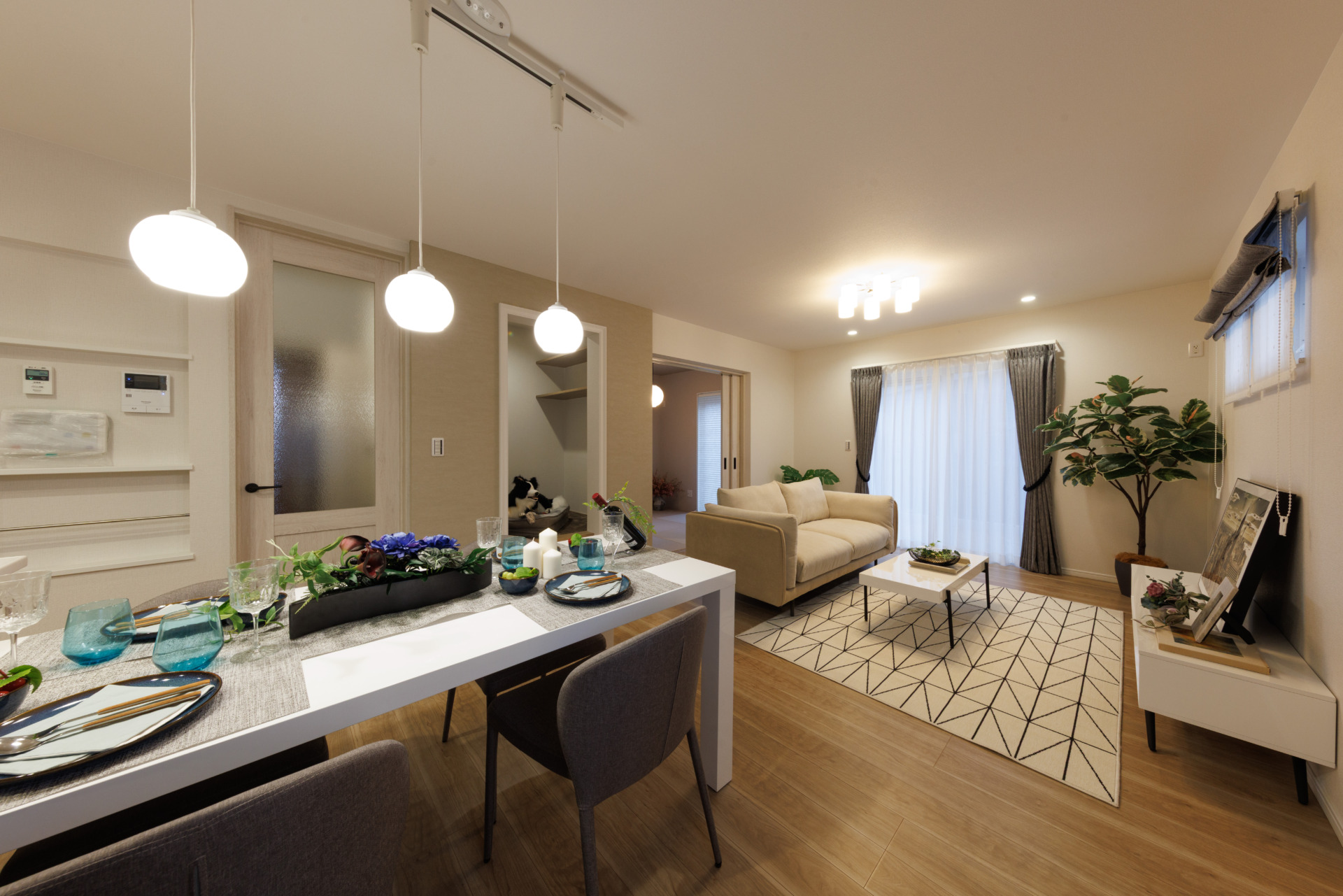 南向きの大きな窓からたっぷり光が注ぐ、ゆとりのある17.7帖のLDK。ダイニングとリビングが自然につながる開放的な空間で、家具配置や生活シーンに合わせたレイアウトがしやすく、家族が集う中心になります。