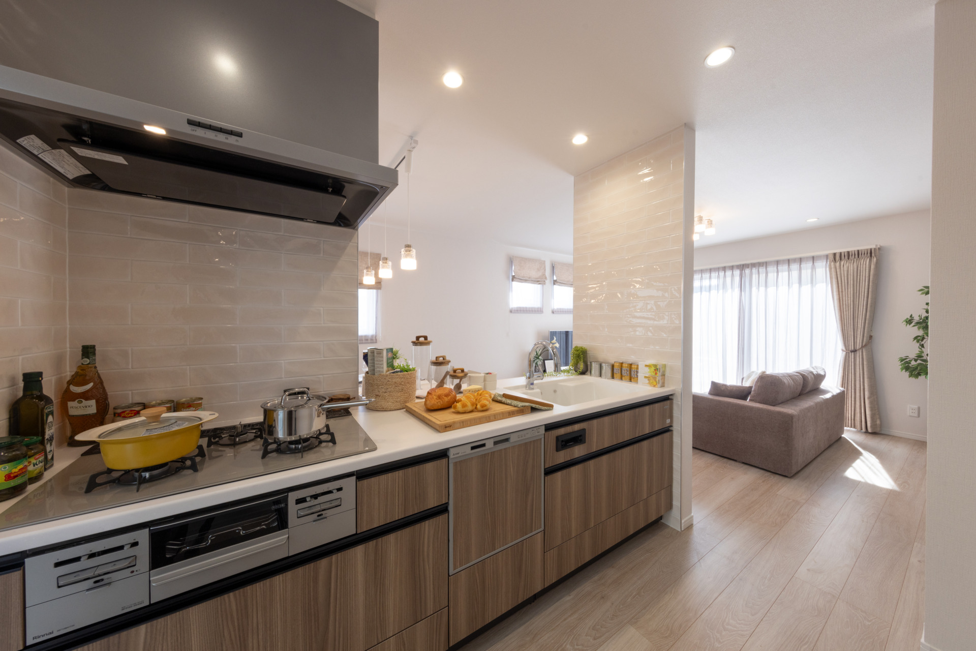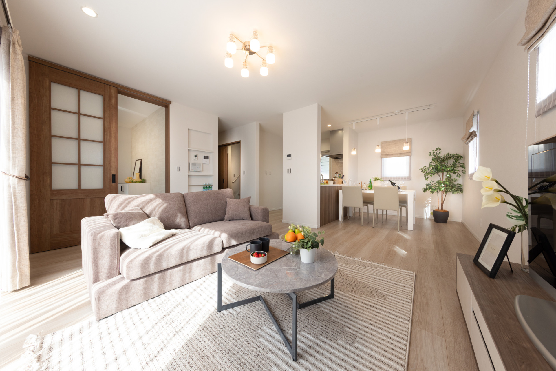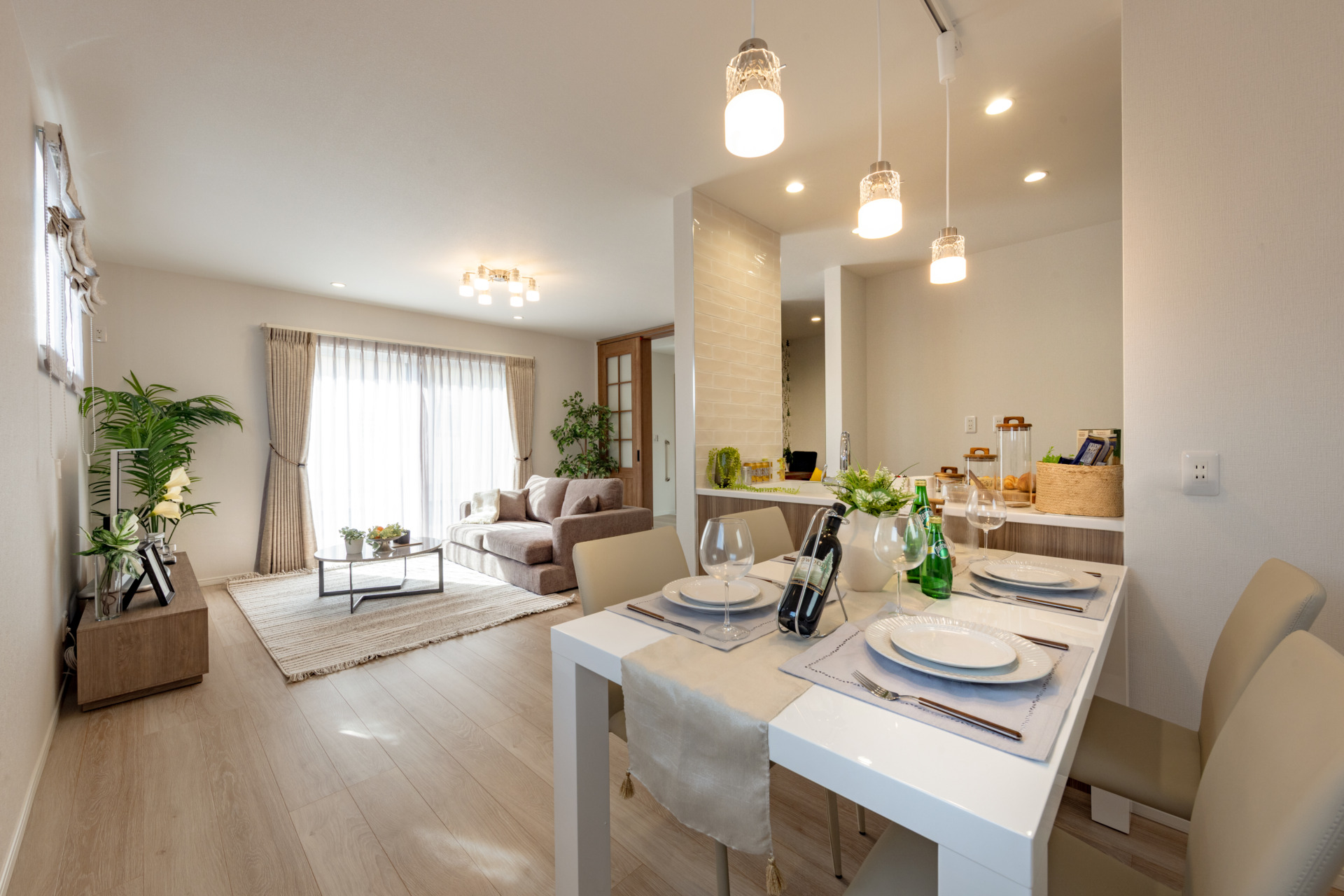 ワイドサッシを採用したリビングは視界が広がり、お庭と一体感のある開放的な空間に。採光性に優れ、窓を開ければ自然の風が通るため室内環境が爽やか。外とつながることで家族の時間がより豊かになります。