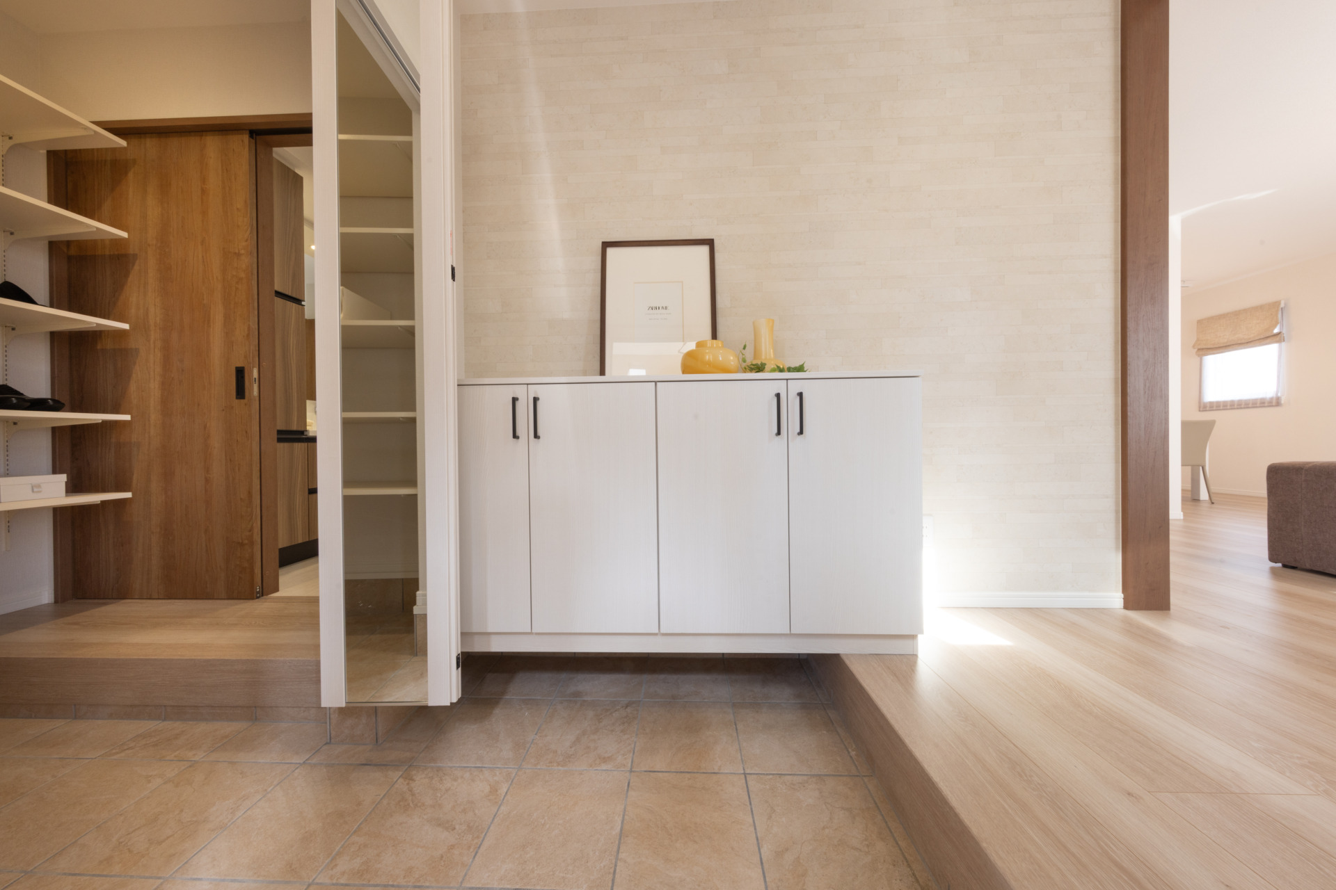玄関横のシューズクロークは靴はもちろん、コートやレインギア、ベビーカーやスポーツ用品まで収められる収納力。出かける前後の動線をスムーズにし、玄関まわりを常に整えられる機能的なスペースです。